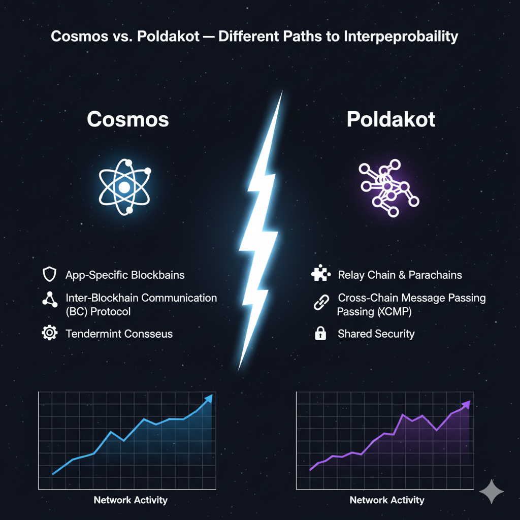 When comparing Cosmos vs Polkadot, both pursue blockchain interoperability but differ in philosophy and execution. This comparison is particularly relevant when evaluating different blockchain architectures, similar to comparing Ethereum vs Solana vs Polygon for DeFi applications.