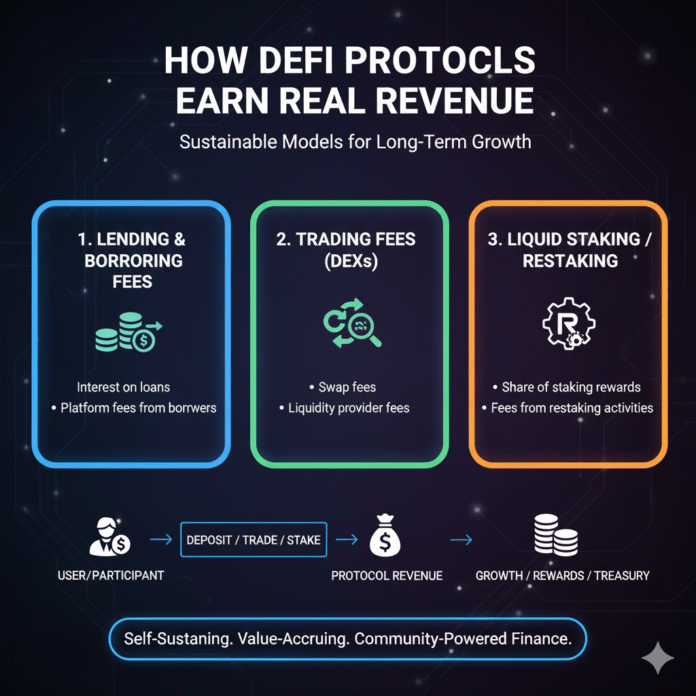DeFi protocols earn real revenue through user fees collected on trades, loans, staking services, and numerous other financial activities. This revenue ensures protocols can continuously innovate, enhance security, and reward their communities for participation.