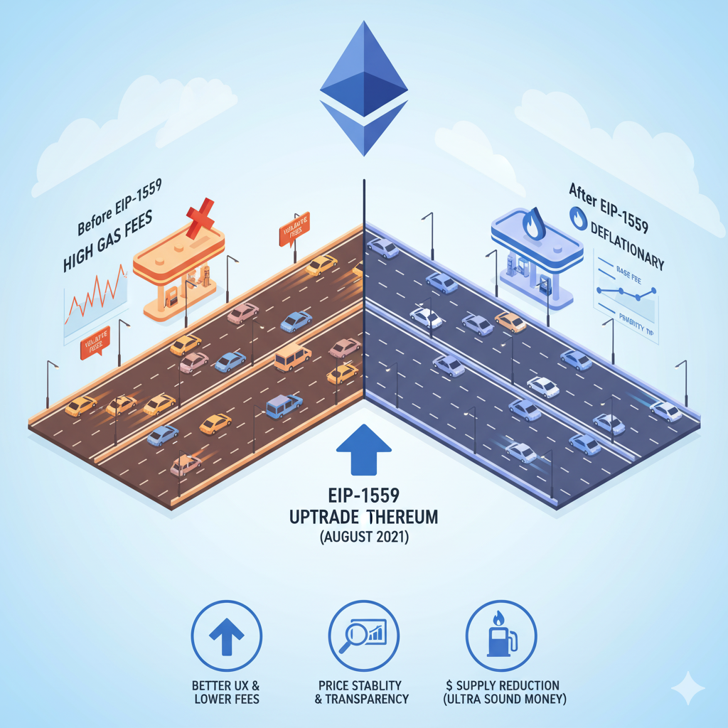 To illustrate, before EIP-1559, Ethereum was a crowded highway with auction-style toll booths—everyone shouting prices. In contrast, with EIP-1559, the protocol posts a clear toll (base fee) that adjusts gradually with traffic. Moreover, you can add a tip to pass sooner. Meanwhile, the posted toll gets shredded (burned) instead of going to the operator—making “tickets” (ETH) a bit scarcer over time.