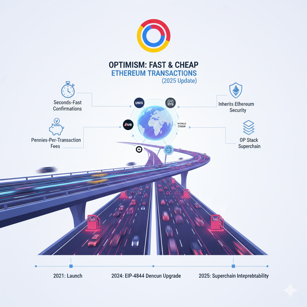 Optimism is a pioneering optimistic rollup Layer 2 network launched in 2021, now powering one of the largest L2 ecosystems in the cryptocurrency space.